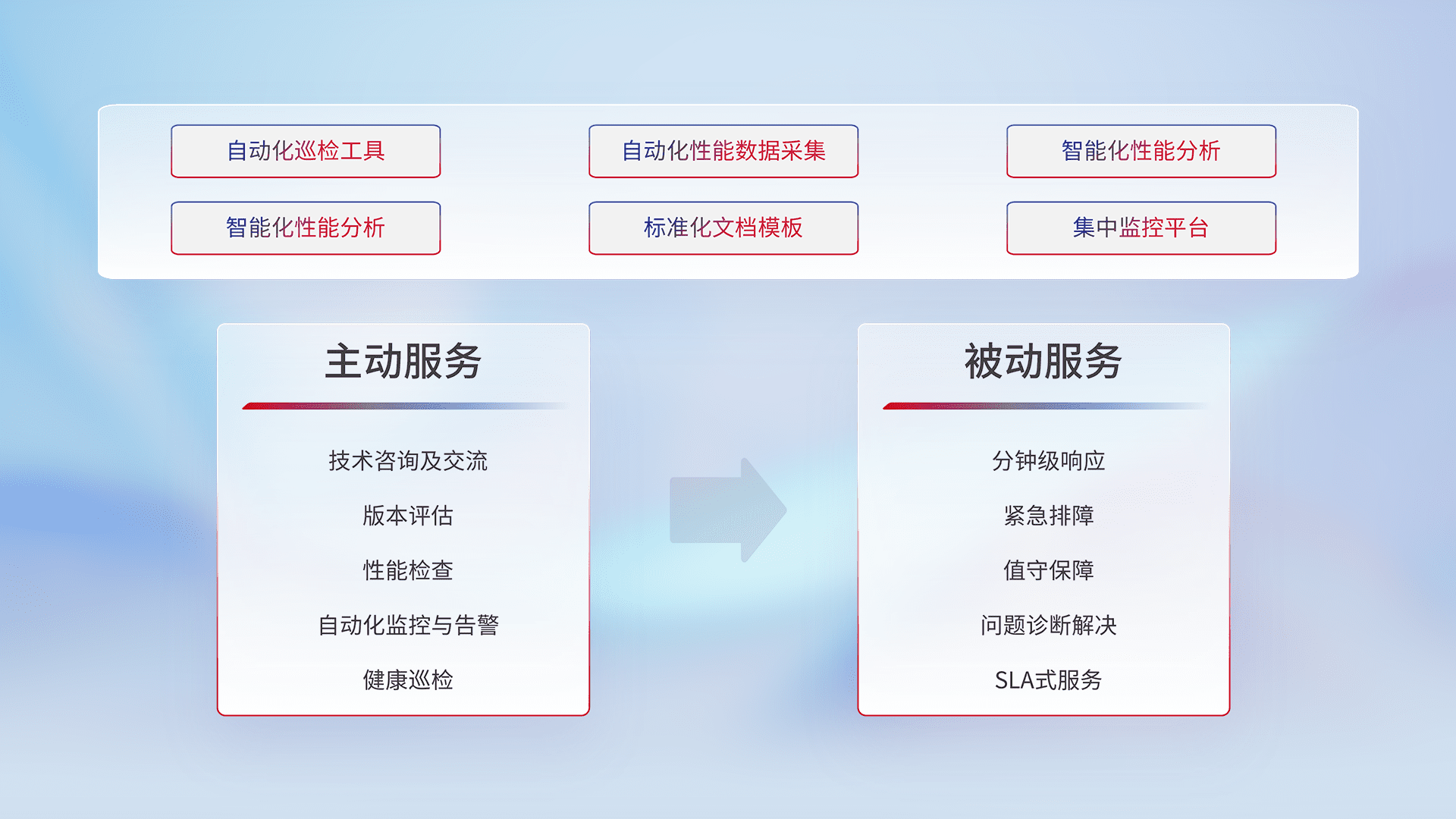 智能化工具和标准化文档,,保障服务质量,,提供主动服务(包含技术咨询、、、、版本评估、、性能检查、、自动化监控与告警、、、、健康巡检)和被动服务包含(分钟级响应、、紧急排障、、、、值守保障、、、问题诊断解决、、SLA服务)。。